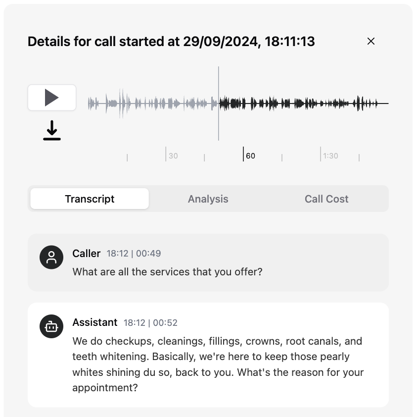 Gain full control over call logs, transcripts, and audio. Optimize voice agent performance with real-time insights